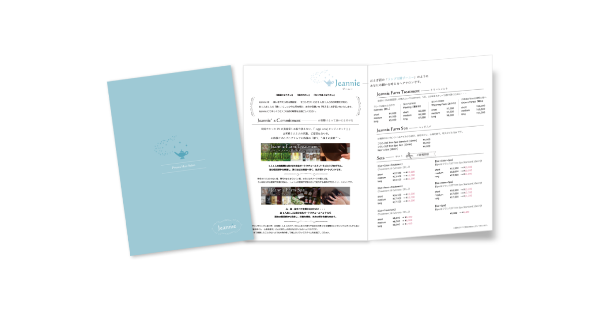 相模原市ある美容室Jeannie(ジーニー)です。オープンする前からいろいろと携わらせていただいたブルーを基調にした素敵な美容室です。オーナーさまのこだわりはとても素晴らしく、ここでしか出来ないこと、お客さまが喜んで下さることを常に真摯に考えていらっしゃいます。店内のブルーとホワイトにあわせた、シンプルだけど、こだわりはしっかりとお伝えするホームページが出来ました。